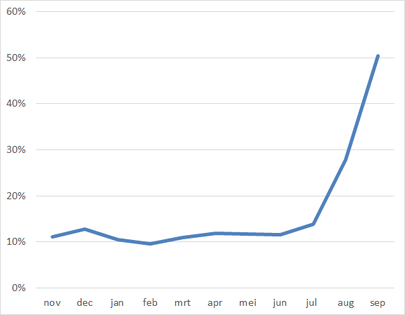 En zou dat samenbrengen tot gevolg hebben gehad dat vacant.nl plotseling door de crawlers van Bullhorn extra aantrekkelijk werden gevonden? Of is dit slechts toeval en moet ik mijn aluminium hoedje afzetten. Geen idee, maar feit blijft dat er tot nu toe geen zinvol vacaturevolume over september kan worden gerapporteerd. En als je naar bovenstaande grafiek kijkt is augustus ook al ferm gemankeerd, en juli een heel klein beetje.