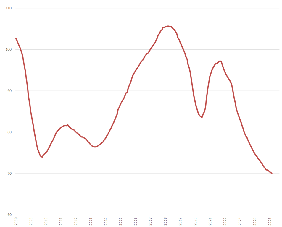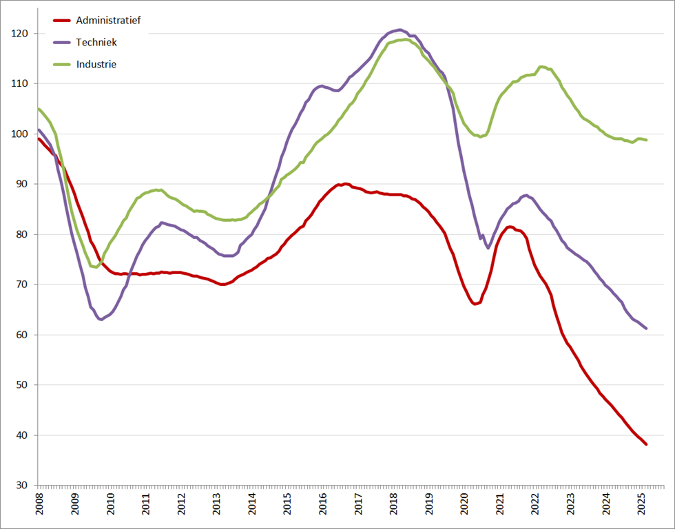 De sector Techniek gaat eveneens behoorlijk steil omlaag, al is de hellingshoek is minder steil van die van Administratief uitzenden. Ondertussen begint deze trendlijn angstig dicht in de buurt van de grenslijn van 60 te komen, niet echt een vrolijkmakende situatie. De trendlijn staat in periode 9 stil op 61,3, een daling van 0,3 ten opzichte van periode 8… Als deze daling doorzet dan kunnen we eind 2025 weleens het doorbreken van de grenslijn in de verkeerde richting gaan meemaken.