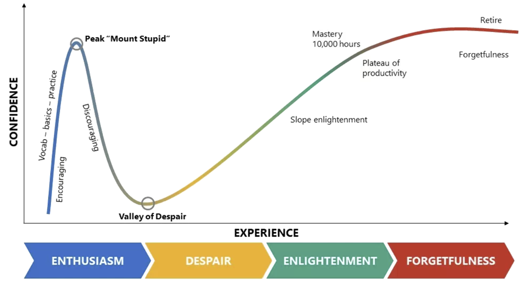 - Valley of Despair. Naarmate het individu verder leert, wordt het geconfronteerd met de werkelijke complexiteit van de materie. Het zelfvertrouwen stort in naarmate ze beseffen hoeveel ze nog niet weten. Dit is een kritiek punt van demotivatie.