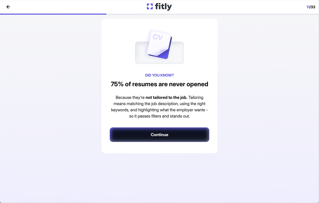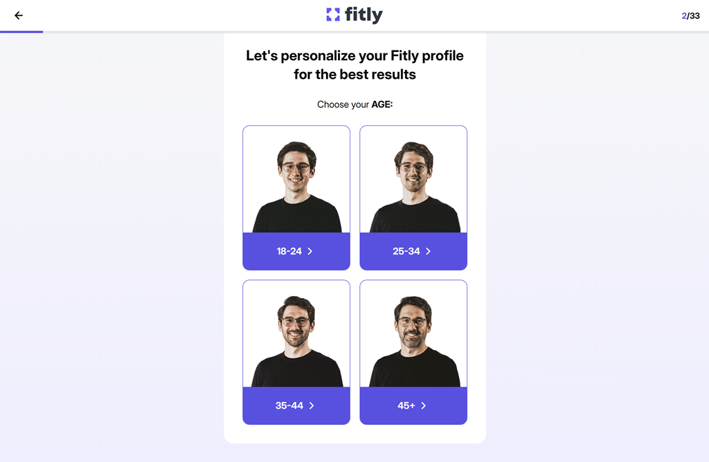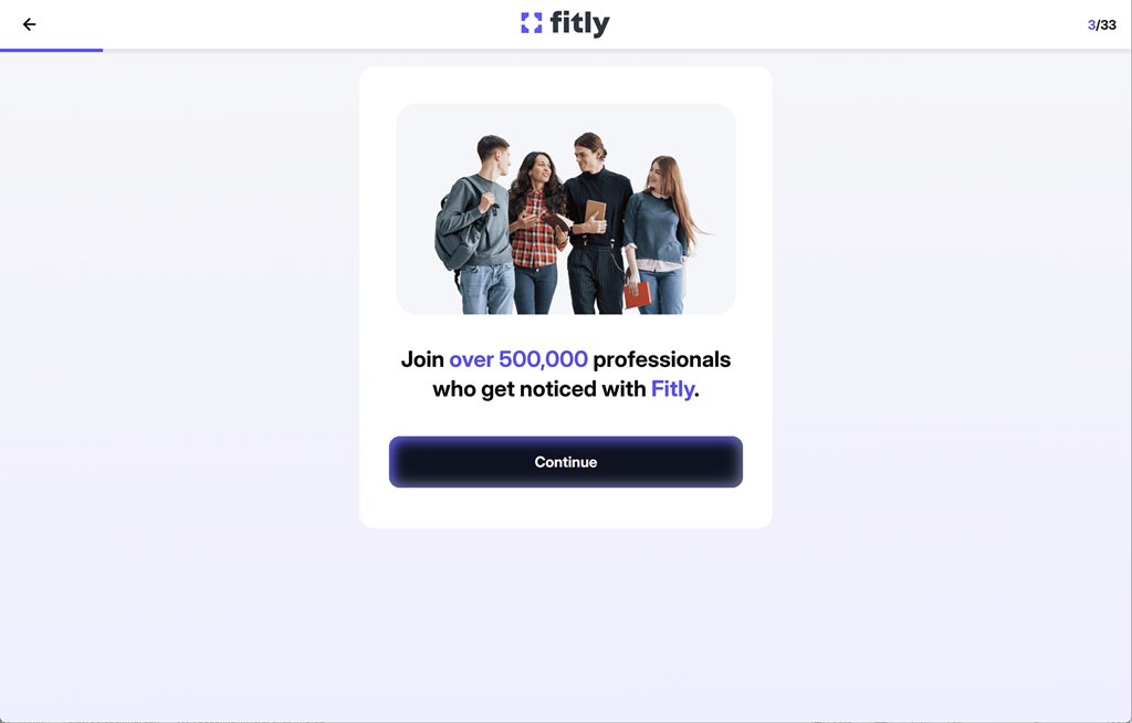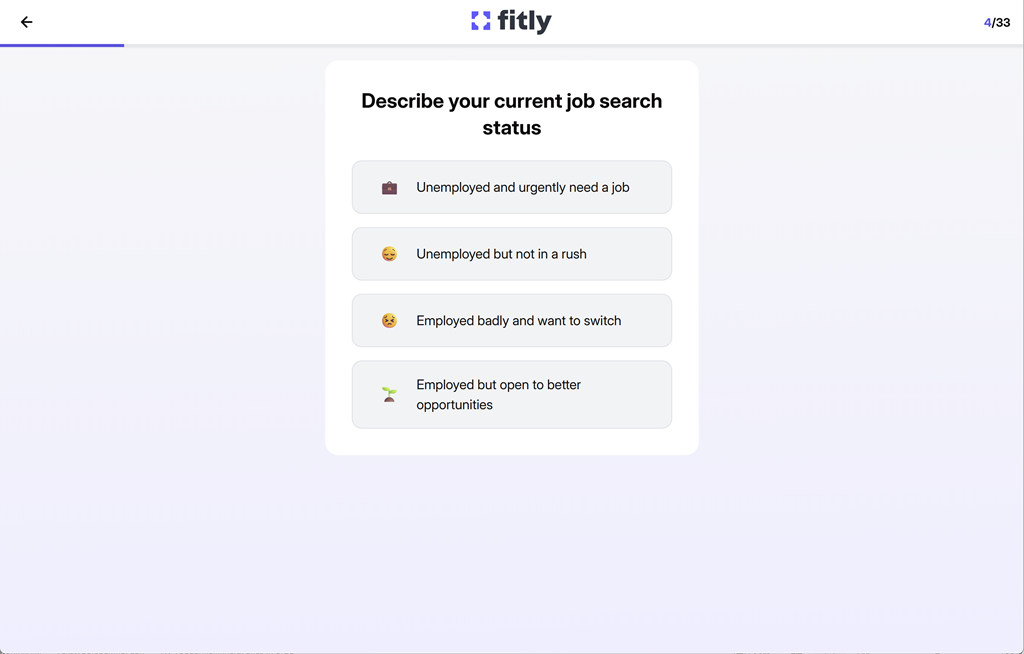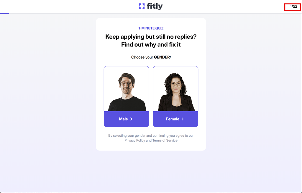 Geen vriendelijke introductie, geen uitleg, geen voordelen maar gewoon van start met een uitvraag. Fitly stelt dat het een 1 minute quiz is, maar dat moet je met een korrel zout nemen. De teller in de rechterbovenhoek geeft al een hint dat het wel iets langer kan duren, ik moet me blijkbaar door een lijst van 33 schermen heenwerken. En 33 schermen binnen 1 minuut doorlopen is natuurlijk weinig realistisch. Maar goed, ik vind het geen probleem om wat tijd te besteden als ik op die manier kan uitvinden waarom ik geen reacties op mijn sollicitaties ontvang. Ik kies mijn gender krijg de volgende vraag van Fitly: