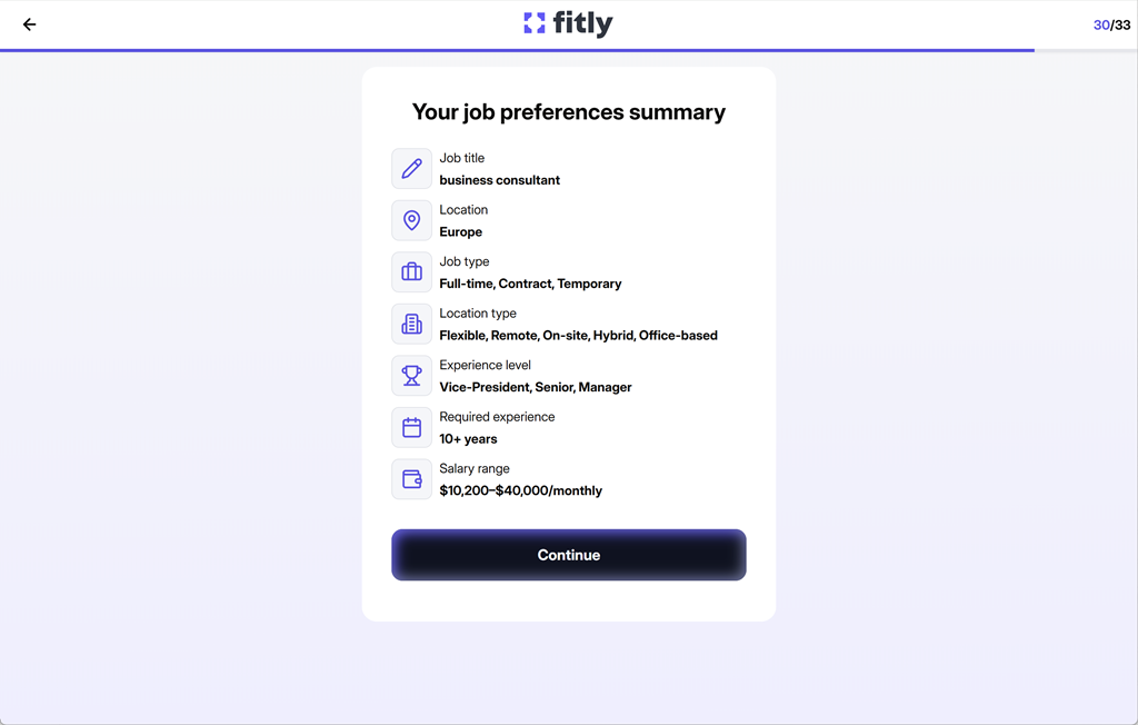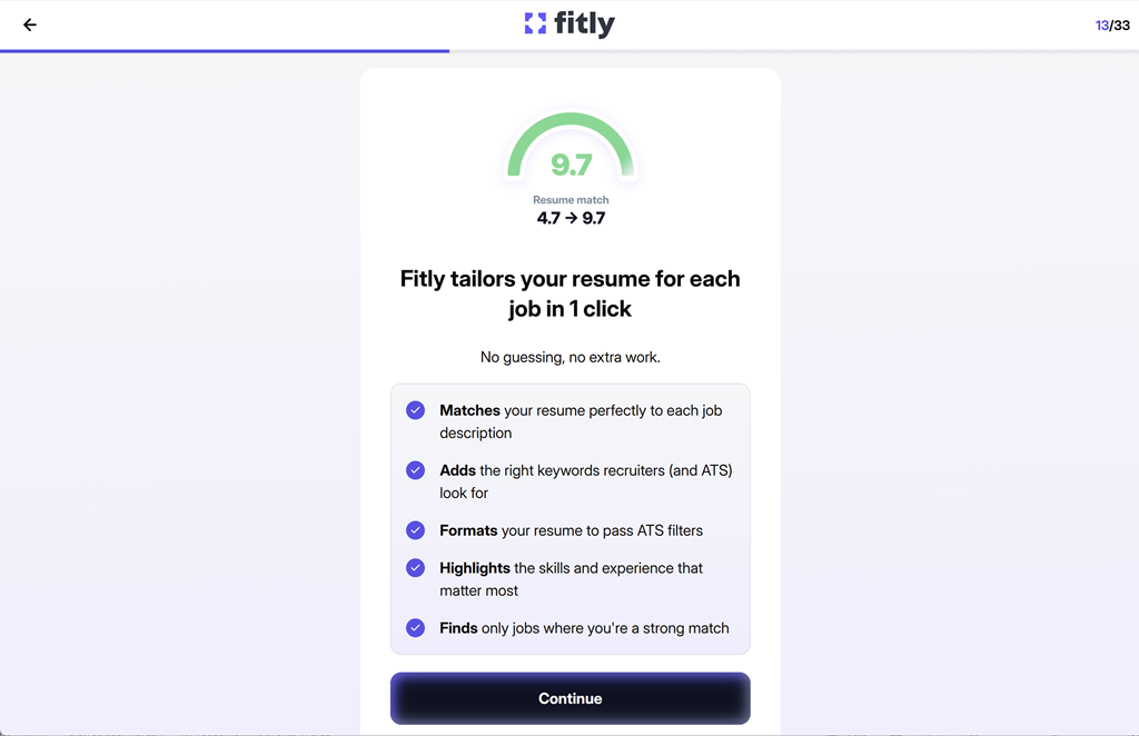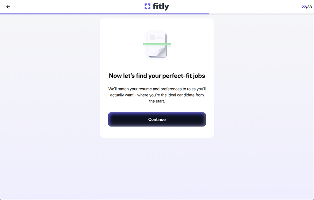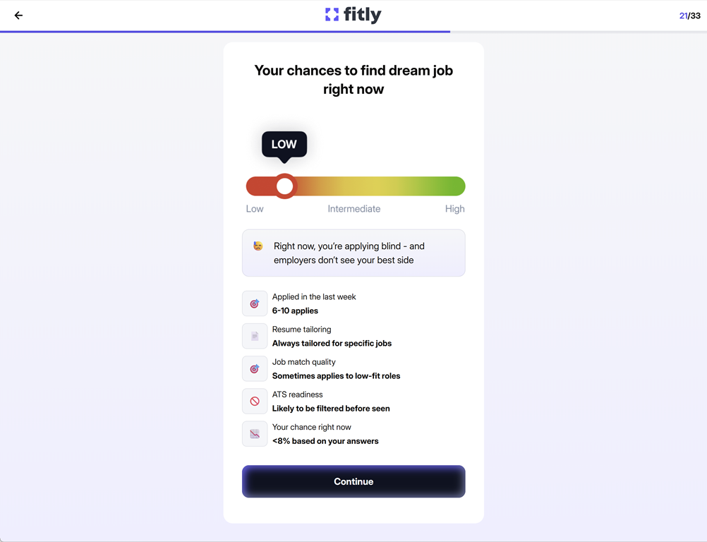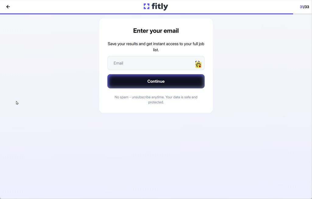Geen vriendelijke introductie, geen uitleg, geen voordelen maar gewoon van start met een uitvraag. Fitly stelt dat het een 1 minute quiz is, maar dat moet je met een korrel zout nemen. De teller in de rechterbovenhoek geeft al een hint dat het wel iets langer kan duren, ik moet me blijkbaar door een lijst van 33 schermen heenwerken. En 33 schermen binnen 1 minuut doorlopen is natuurlijk weinig realistisch. Maar goed, ik vind het geen probleem om wat tijd te besteden als ik op die manier kan uitvinden waarom ik geen reacties op mijn sollicitaties ontvang. Ik kies mijn gender krijg de volgende vraag van Fitly:
