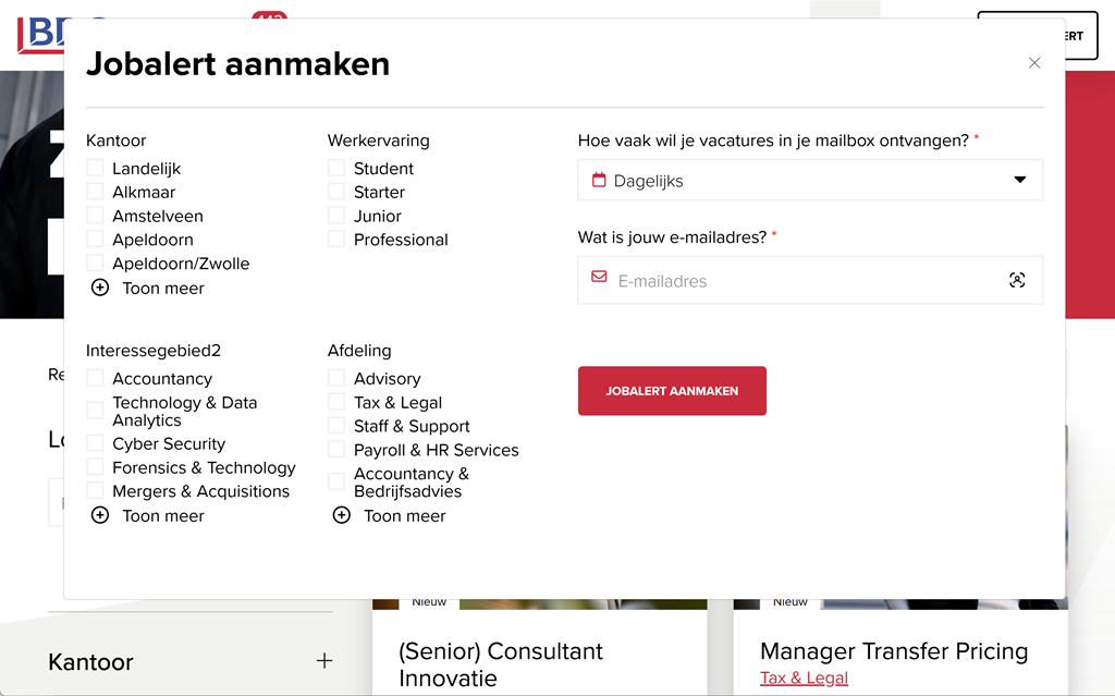 Homepage, pop-up Jobalert aanmaken – Werken bij BDO