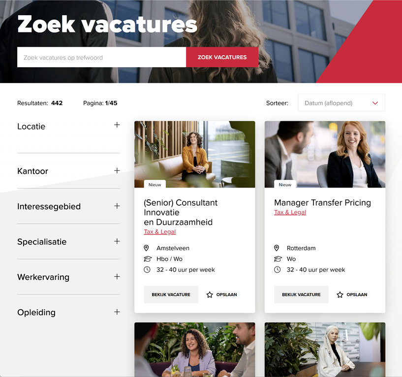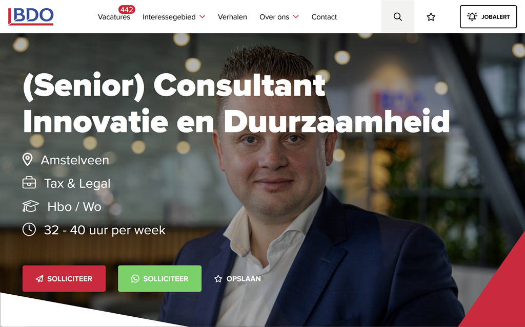 Een klassieke zoekresultaatpagina, met filters aan de linkerkant en passende zoekresultaten, in de vorm van tiles, aan de rechterkant. Die tiles zijn vast gekozen vanwege de mobile interface, ze vreten een partij verticale real-estate waar je u tegen zegt (mede dankzij een kleurig plaatje boven elke vacature). De getoonde informatie per vacature is kleiner dan de getoonde filters, wat betekent dat met het gebruiken van filters waarbij de filteropties niet worden getoond er geen mogelijkheid is om te valideren of de zoekopdracht goed is gegaan. Da’s niet zo handig. Verder blijken de kleurige plaatjes te rouleren. Als laatste aandachtspunt de link Tax & Legal, die bij de twee getoonde vacatures in BDO rood worden getoond. Als ik daarop klik ga ik naar een zoekresultaatpagina met vacatures voor interessegebied Tax & Legal. Niets mee mis natuurlijk, maar waarom zijn de andere bij de vacature getoonde criteria dan geen link? Don’t make me think…