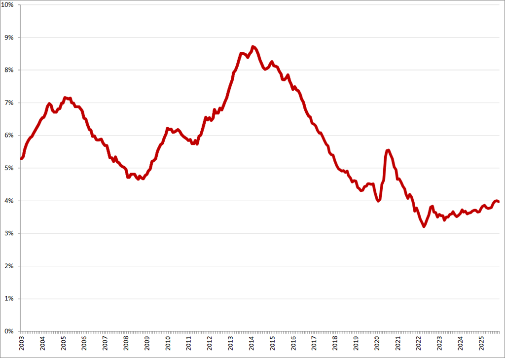 Gecorrigeerde werkloosheidspercentages, januari 2003 – november 2025. Bron: CBS