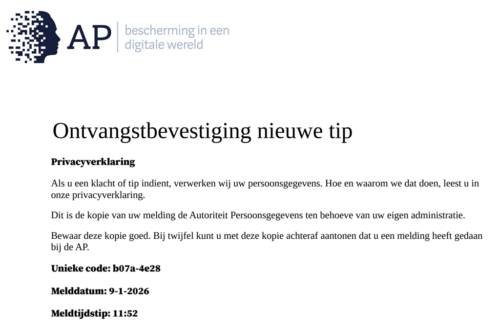 Vandaag heb ik, volgens het protocol van de Autoriteit Persoonsgegevens (AP), een tip ingediend: