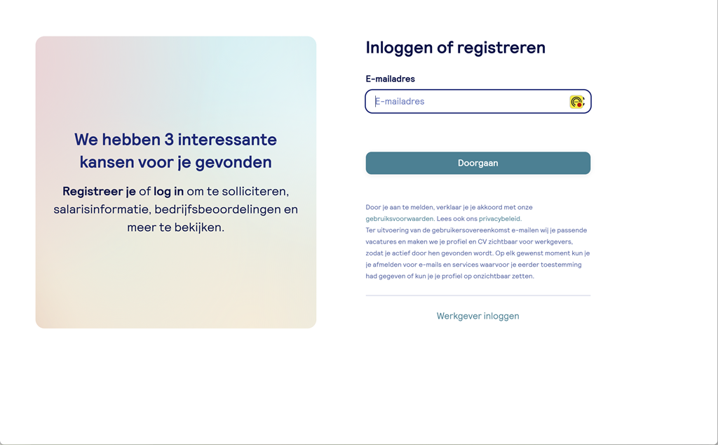 Ik zegt lijkt, want als je hier vervolgens probeert te zoeken, ga je een wizard proces in waarbij je een functietitel, een locatie, je e-mailadres, of je al dan niet actief op zoek bent moet opgeven, om vervolgens op onderstaand scherm te belanden:![]()