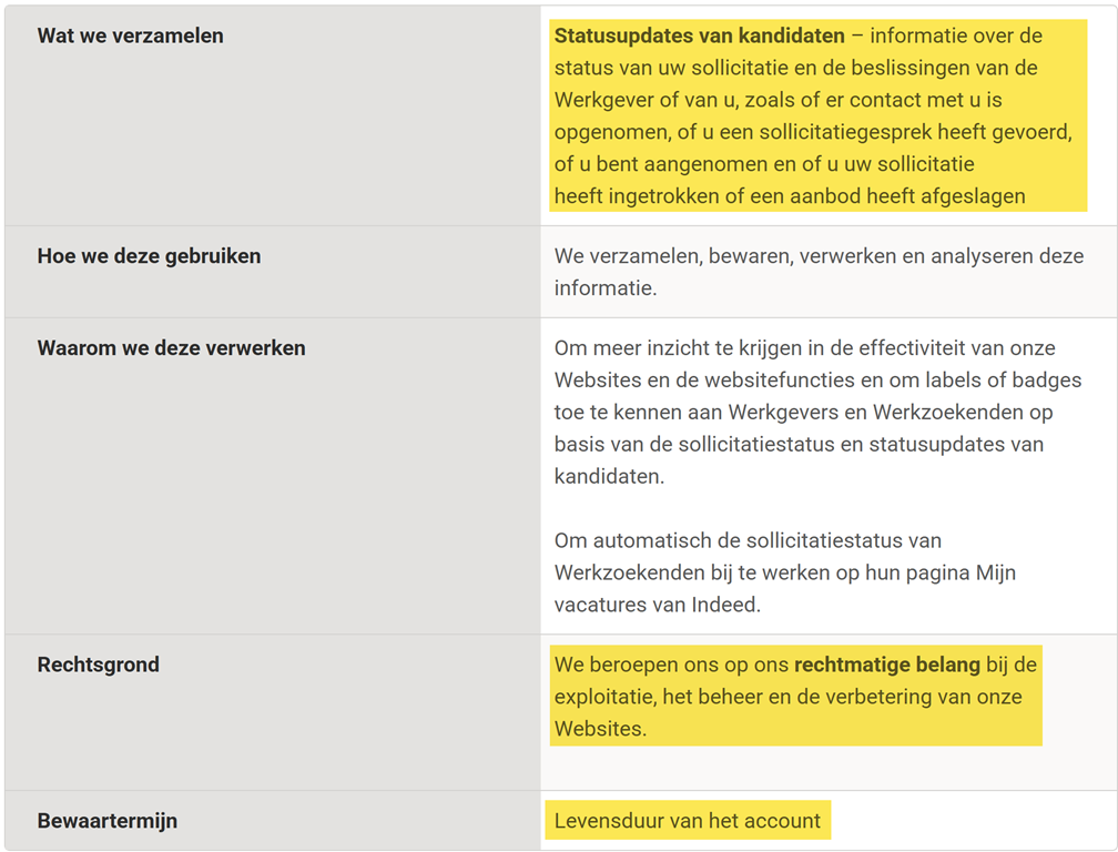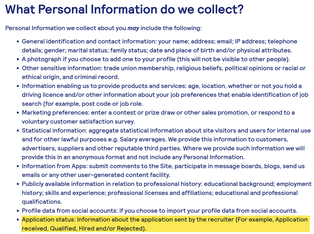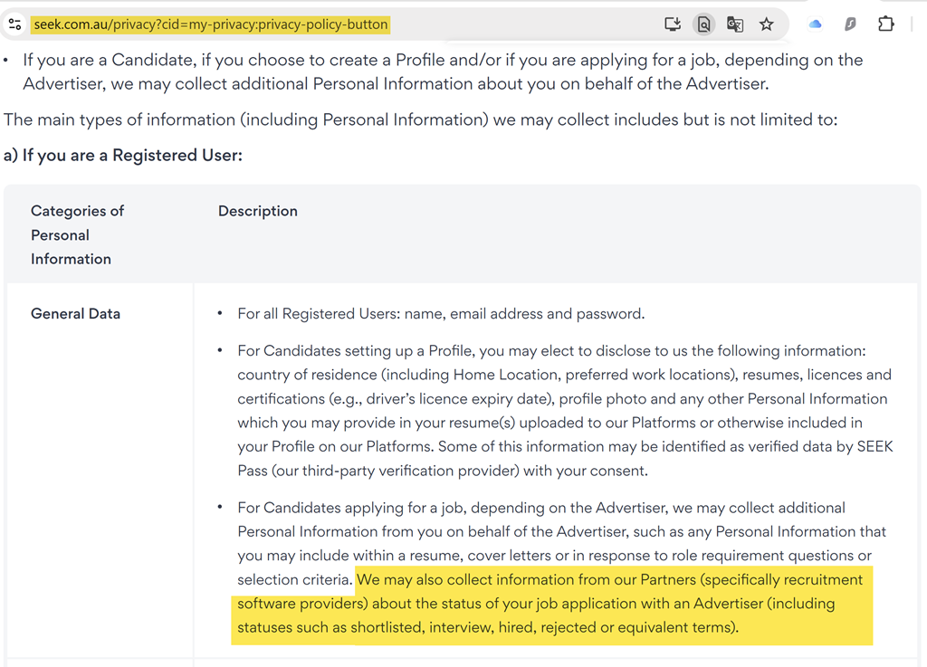 En dan nu de privacyverklaringen van Stepstone, Totaljobs en Seek, die allen aangeven disposition data te verzamelen van haar gebruikers.