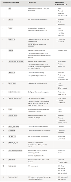 - rawDispositionStatus (de status zoals de werkgever die gebruikt, en waar Indeed niets mee te maken heeft)