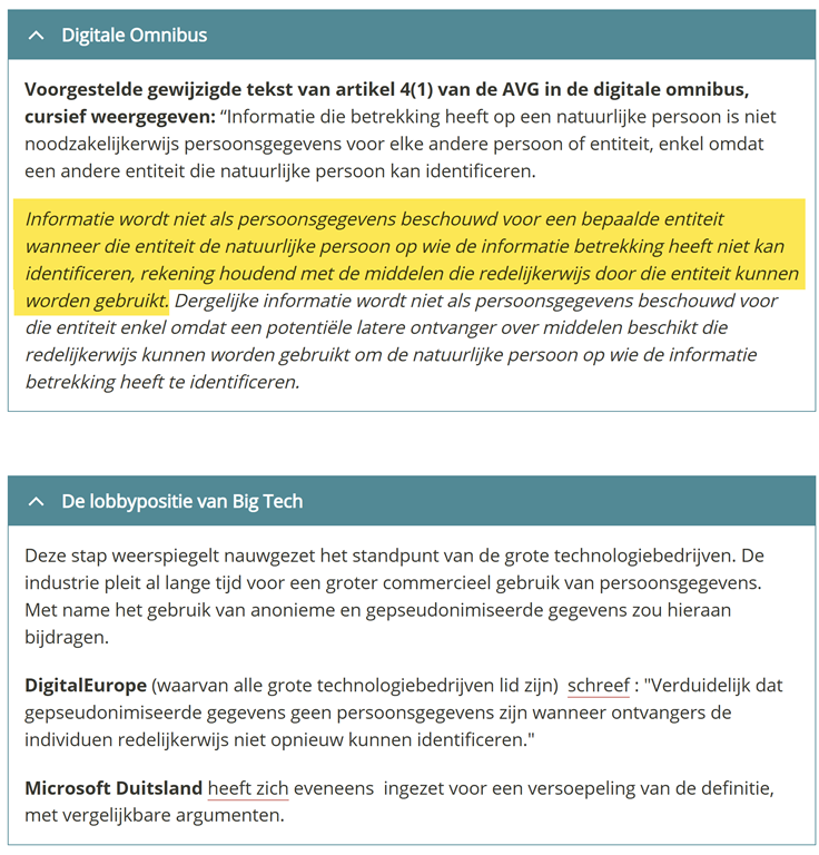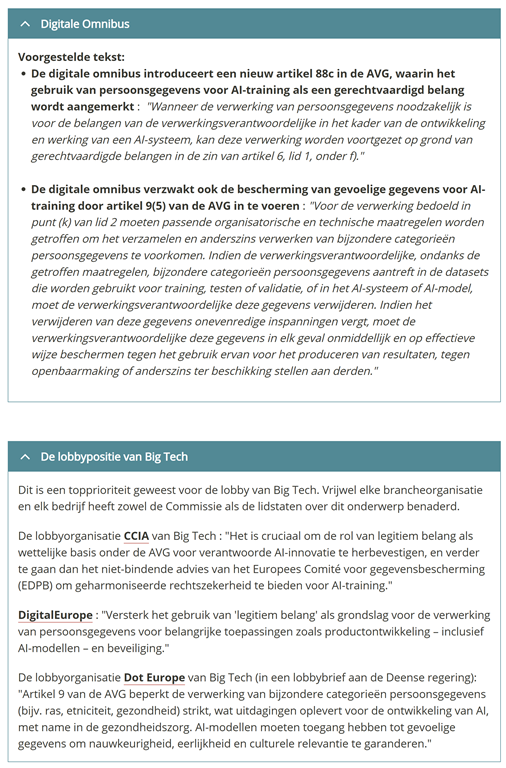Hieronder is de informatie uit de Digital Omnibus vergeleken met de lobbypositie van Big Tech: