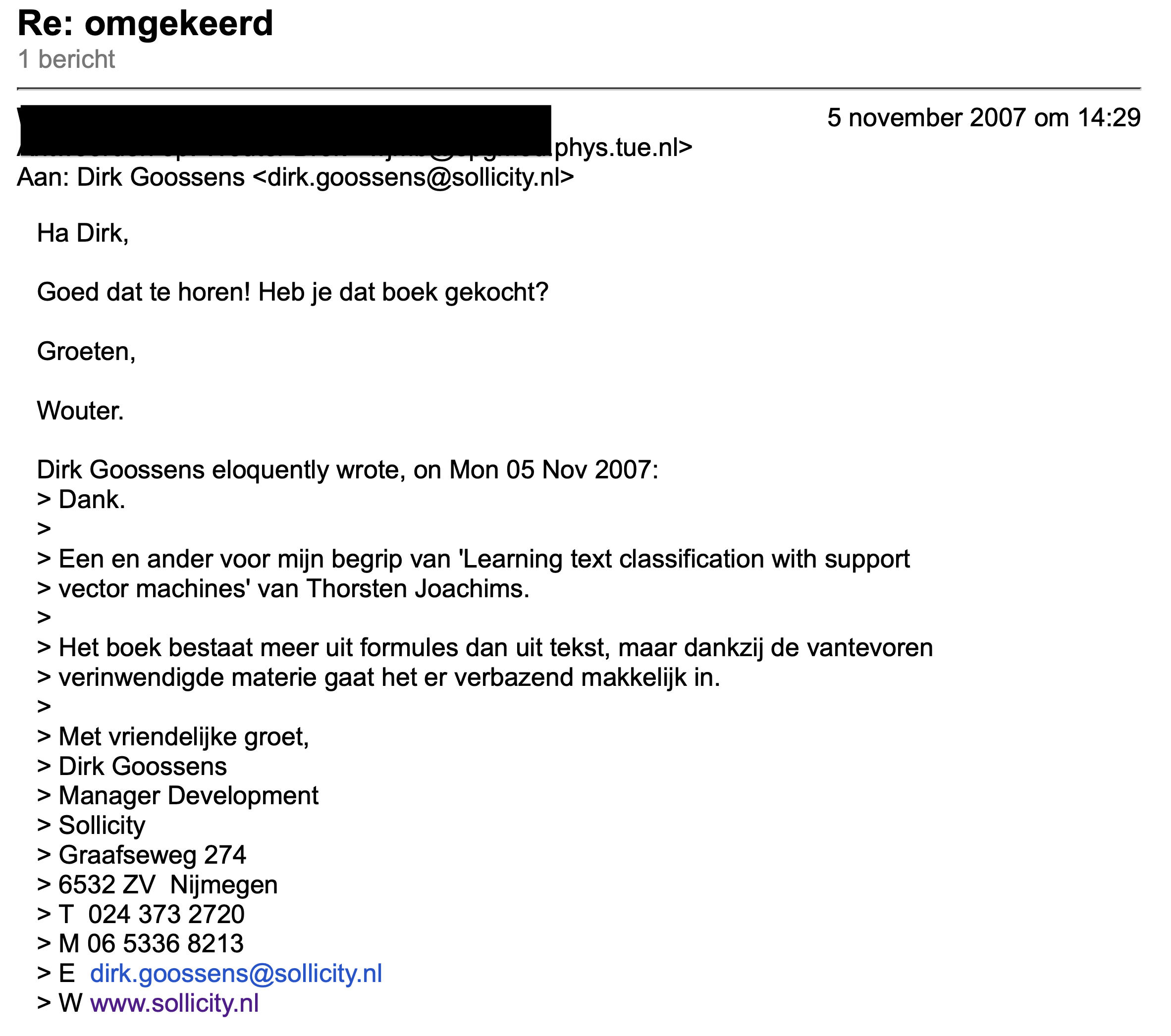 Met het boek en de simpele open source software had ik al snel een support vector machine draaien. Ik noemde hem Emiel. Met Emiel kon ik vacatures classificeren.