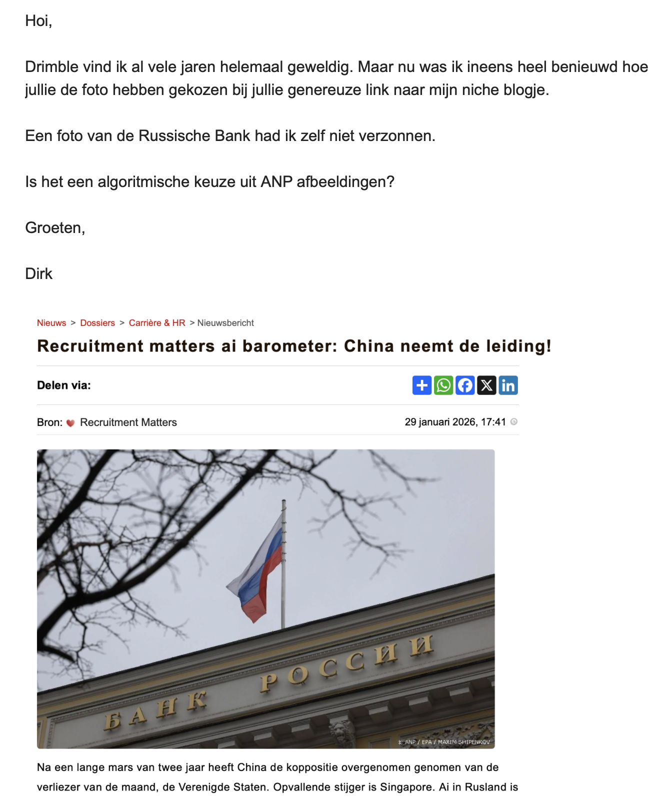 Gisteren nam China de leiding in de onvolprezen recruitment matters ai barometer. Rusland speelde geen rol van betekenis. Nog dezelfde dag werd de barometer door Drimble aan de Staatsbank van Rusland gelinkt.