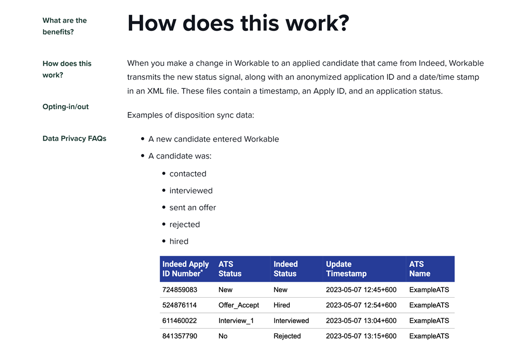 Ik begin met de Workable pagina genaamd Sharing Disposition Data with Indeed:![]()
