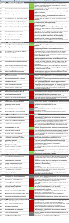 Om maar meteen het vraagteken te ontkrachten; het Adviescollege heeft in mijn optiek degelijk werk verricht en zich dus zeker niet gedragen als de spreekwoordelijke slager. Zoals hieronder duidelijk wordt, is er door het Adviescollege een bloedbad vastgesteld bij het UWV project Bemiddelingsservice. Maar ik laat de beoordeling graag aan de lezer over en geef hieronder de resultaten weer via de methodiek van het Adviescollege; in totaal 9 risicogebieden elk met meerdere toetsaspecten die negatief (rood) of positief (groen) kunnen uitvallen. In een beperkt aantal gevallen is geen resultaat gevonden (grijs). De tekst rechts van het oordeel is een snippet uit het rapport op basis waarvan het oordeel is gevormd:![]()