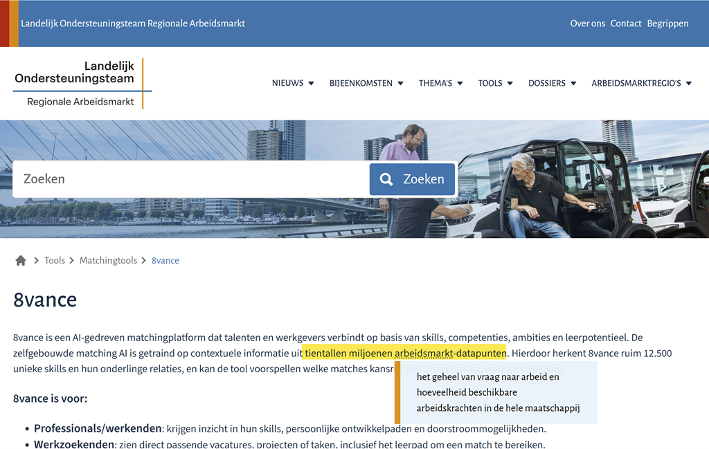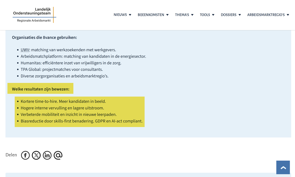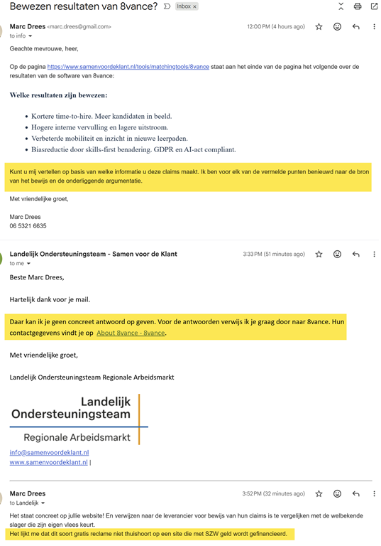 Om te beginnen, de lijst van organisaties die 8vance gebruiken. Die klopt niet, het UWV maakt (nog) geen gebruik van 8vance en Arbeidsmatchplatform maakt geen gebruik meer van 8vance. De anderen zijn te klein om aandacht aan te besteden.