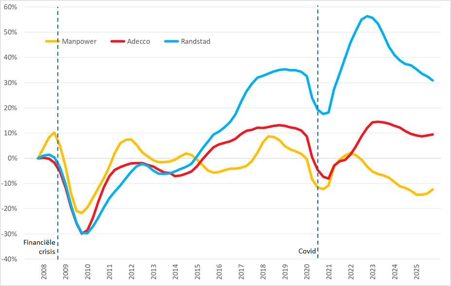 Dat uitzenders in het algemeen zeer crisisgevoelig zijn, blijkt duidelijk uit bovenstaande grafiek. De financiële crisis en het langdurig herstel zijn goed zichtbaar (met name in de trendlijnen van Randstad en in mindere mate Adecco, de trendlijn van Manpower laat de recessies duidelijk zien), evenals de economische boom die daarop volgde. Aansluitend is daar de ineenzakking als gevolg van de covid pandemie en het daarop volgende, zeer krachtige herstel. Randstad zit ondertussen 3 jaar in een ferme rimpfase, Manpower laat opvallend genoeg de laatste drie kwartalen een (zij het zeer licht) herstel zien en en ook bij Adecco is een zzer licht herstel in de laatste 2 kwartalen zichtbaar. Randstad is op dit gebied dus het lelijke eendje, waarbij het maar zeer de vraag is of er in 2026 een sprake kan zijn van herstel gezien de zeer onzekere economische situatie als gevolg van de oplopende geopolitieke spanningen. Waarmee het ook meteen de vraag is of Adecco en Manpower hun voorzichtige groeicijfers kunnen continueren.