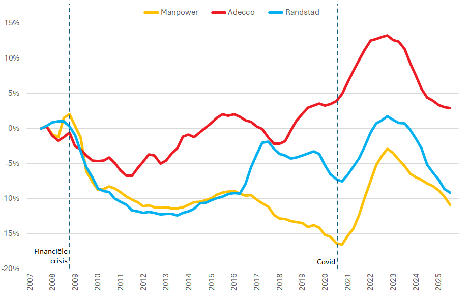 Manpower heeft zich in het begin van de financiële crisis in negatieve zin losgejubeld van de andere twee uitzendreuzen en is ze vervolgens volledig uit het oog verloren. Manpower is tot en met het begin van de coronacrisis steeds verder verwijderd geraakt van Adecco en Randstad maar heeft zich in het vervolg kranig geweerd.
