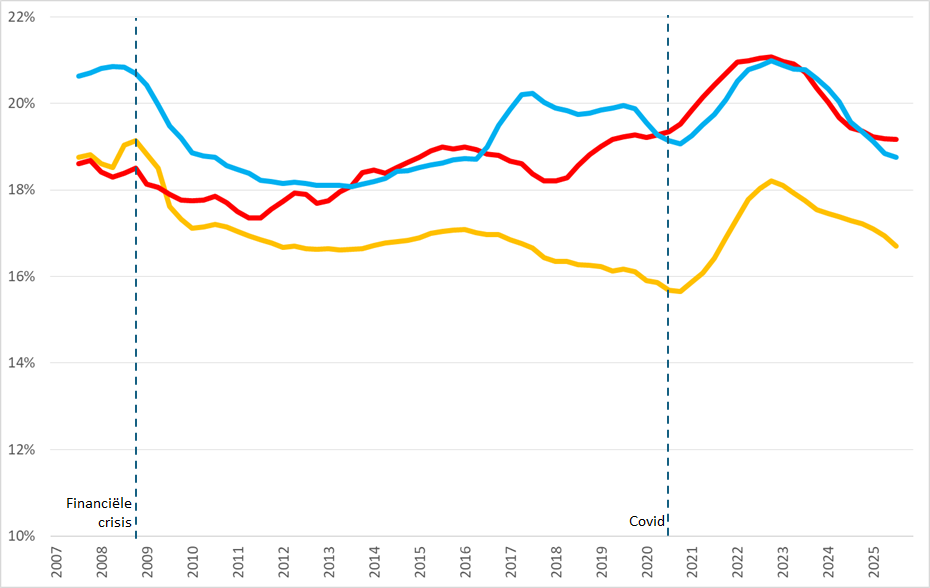 Voortschrijdende brutomarge (2007 =0%) op jaarbasis, Q2 2007 – Q4 2025