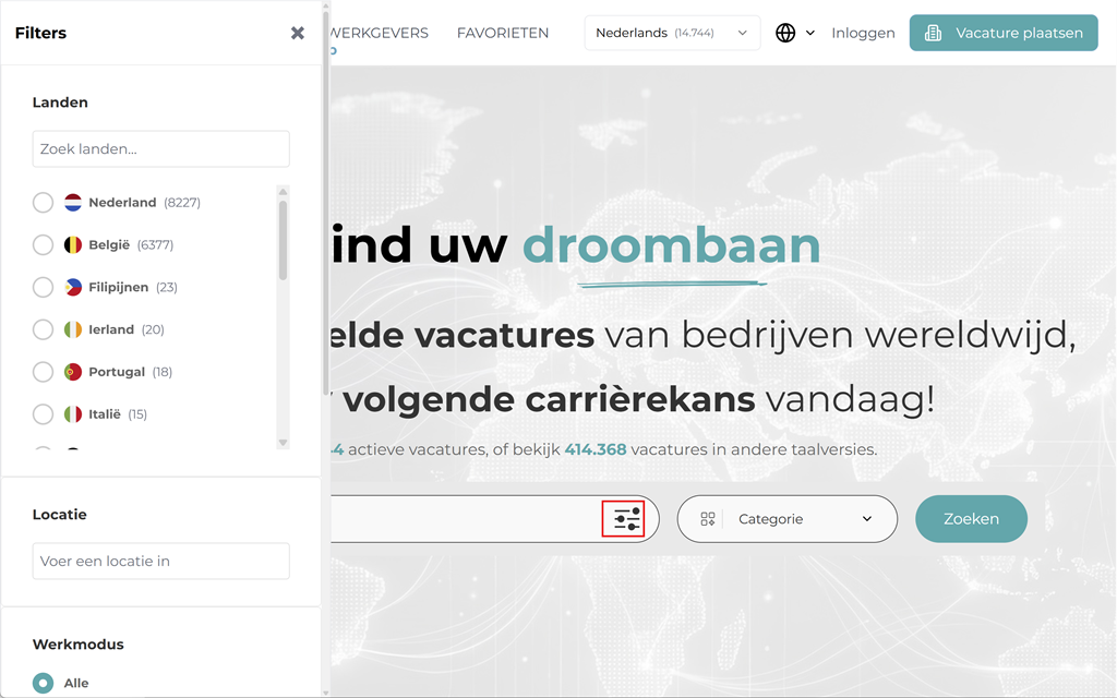 Inderdaad, in het Nederlands, met een snelzoekfunctie waarbij opvalt dat het Wat veld uitsluitend voor functie lijkt te zijn bedoeld, maar waar in het veld ook een icon wordt weergegeven voor filters. En een tweede zoekveld waar geen locatie kan worden opgegeven maar uitsluitend op bedrijfssector kan worden gezocht. Apart.