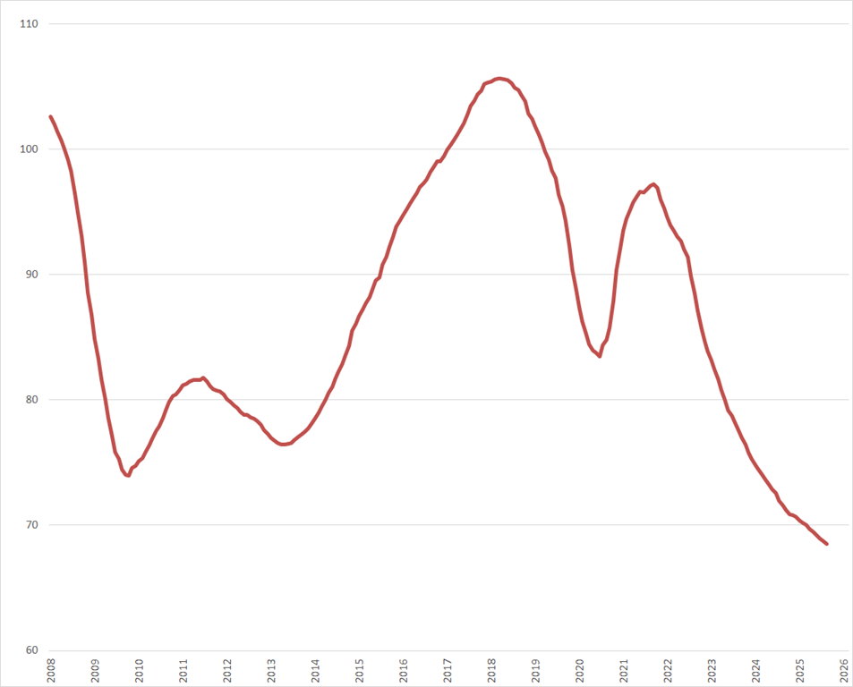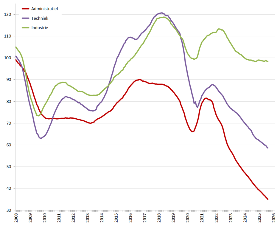 De sector Administratief is scherp gedaald (-20%) . De index staat nu op 35,0. Een zeer stabiele krimp dus, en dat voorspelt weinig goeds voor de komende periodes. Het zal toch niet zo zijn dat we in 2026 gaan meemaken dat de trendlijn in de buurt van de grenslijn van 30 gaat komen? Dan kunnen we beter met zijn allen vaststellen dat administratief uitzenden een soort boutique werkvorm is geworden die met een uitgereikt uitstervingsproces bezig is.