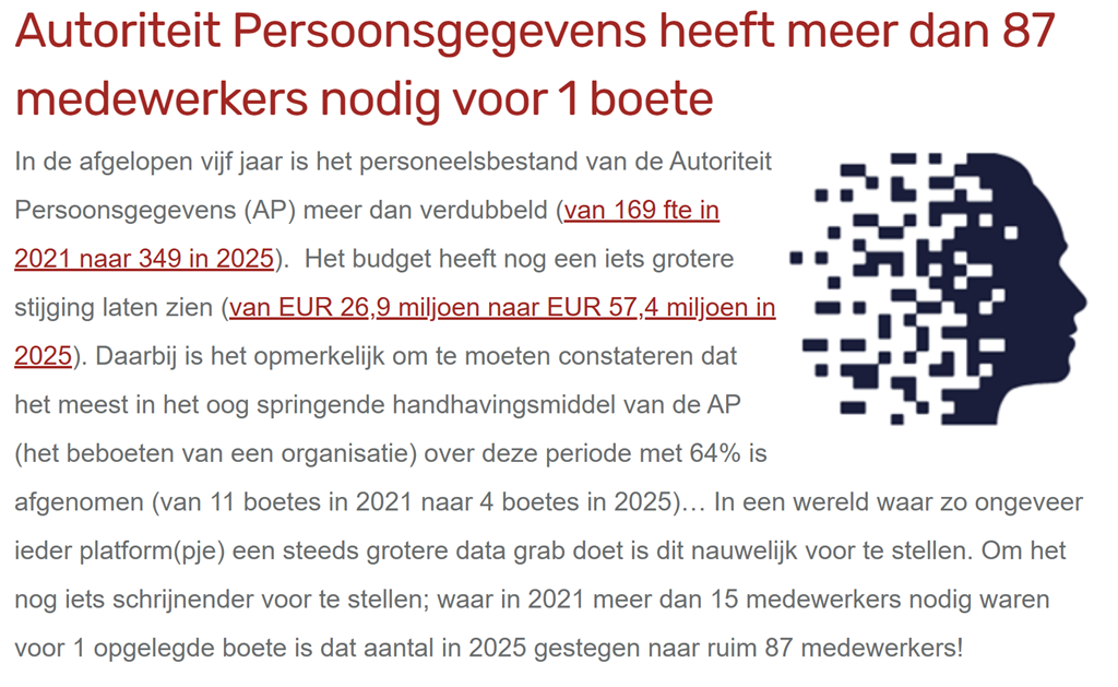 Het is in mijn optiek minstens zo schokkend dat de interviewer Wolfsen niet kritisch bevraagd. Zoals de voor de hand liggende vraag: wat doen die andere 339 fte (349 – 10) dan bij de AP? Of de vraag: er is een inverse relatie tussen het aantal AP medewerkers en het aantal uitgekeerde boetes. Hoe komt dat?