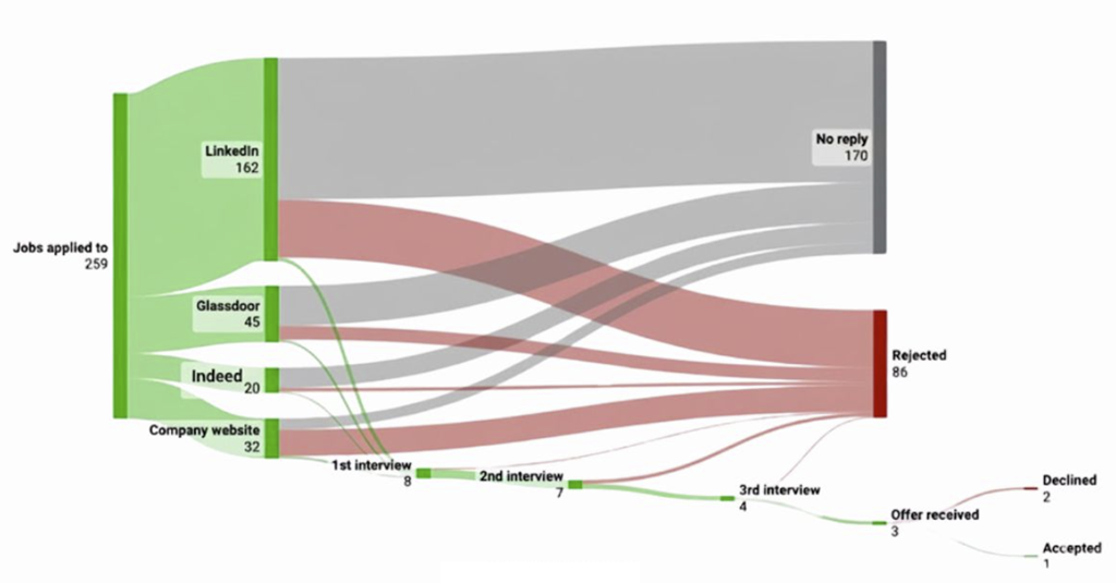 Onderstaand een prachtige en compacte (Sankey diagram) weergave van de zoektocht van een werkzoeker naar een (nieuwe) baan: