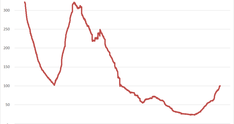 Aantal meldingen van het woord “recessie”, 365-daags voortschrijdend gemiddelde, februari 2009 – recent. Bron: Coosto
