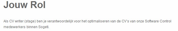 Hoe kun je je incompetentie nog dwazer tentoonspreiden. Vandaag viel mijn oog op een tweet van een recruiter van Sogeti. Ze zijn op zoek naar een stagiair. Om de CV’s van de medewerkers te (her)schrijven. Ja echt.