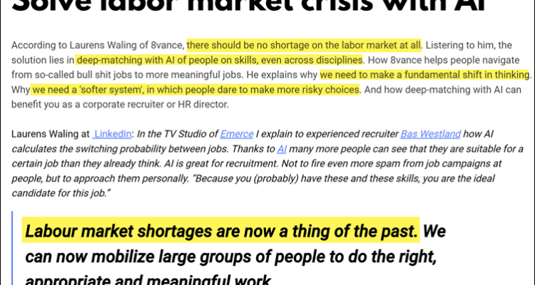 8vance profileert zichzelf onder meer met de termen skills-based recruitment en AI-driven workforce agility. Buzzwords natuurlijk, maar skills en AI blijven tegenwoordig wel hangen. En op de site van 8vance valt daar nog iets meer over te vinden: